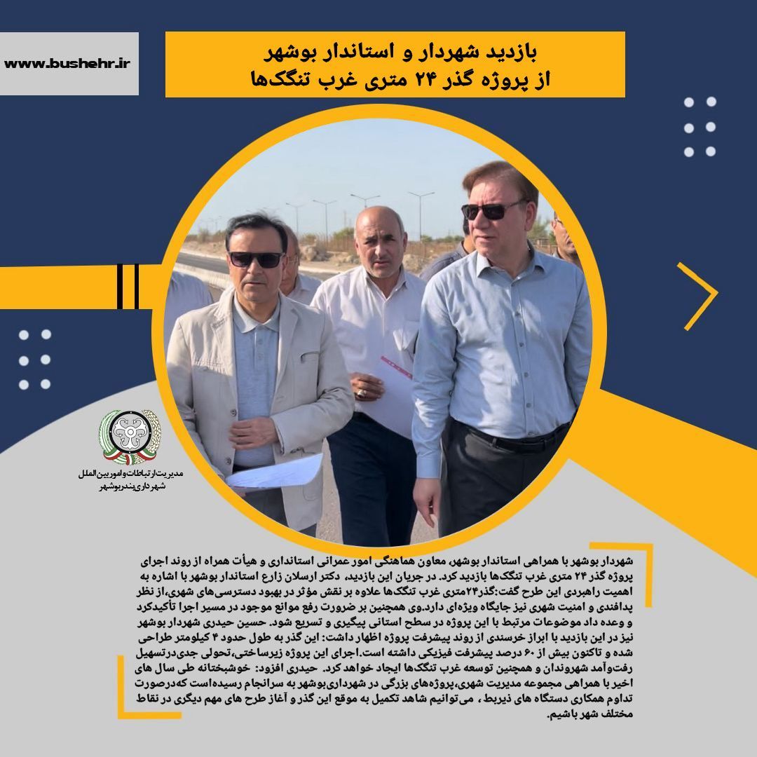 بازدید شهردار و استاندار بوشهر از پروژه گذر ۲۴ متری غرب تنگکها شهردار بوشهر با همراهی استاندار بوشهر، معاون هماهنگی امور عمرانی استانداری و هیأت همراه از روند اجرای پروژه گذر ۲۴ متری غرب تنگکها بازدید کرد. در جریان این بازدید، دکتر ارسلان زارع استاندار بوشهر با اشاره به اهمیت راهبردی این طرح گفت: گذر ۲۴ متری غرب تنگکها علاوه بر نقش مؤثر در بهبود دسترسیهای شهری، از نظر پدافندی و امنیت شهری نیز جایگاه ویژهای دارد. وی همچنین بر ضرورت رفع موانع موجود در مسیر اجرا تأکید کرد و وعده داد موضوعات مرتبط با این پروژه در سطح استانی پیگیری و تسریع شود. حسین حیدری شهردار بوشهر نیز در این بازدید با ابراز خرسندی از روند پیشرفت پروژه اظهار داشت: این گذر به طول حدود ۴ کیلومتر طراحی شده و تاکنون بیش از ۶۰ درصد پیشرفت فیزیکی داشته است. اجرای این پروژه زیرساختی، تحولی جدی در تسهیل رفتوآمد شهروندان و همچنین توسعه غرب تنگکها ایجاد خواهد کرد. حیدری افزود: خوشبختانه طی سالهای اخیر با همراهی مجموعه مدیریت شهری، پروژههای بزرگی در شهرداری بوشهر به سرانجام رسیده است که در صورت تداوم همکاری دستگاههای ذیربط، میتوانیم شاهد تکمیل بهموقع این گذر و آغاز طرحهای مهم دیگری در نقاط مختلف شهر باشیم. گفتنی است، پروژه گذر ۲۴ متری غرب تنگکها با هدف روانسازی ترافیک، افزایش ایمنی، ارتقای خدمات شهری و تقویت زیرساختهای پدافندی در حال اجراست و تکمیل آن نقش مهمی در بهبود کیفیت زندگی ساکنان این منطقه خواهد داشت.