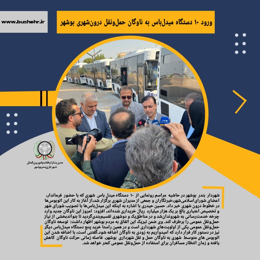 ورود ۱۰ دستگاه میدلباس به ناوگان حملونقل درونشهری بوشهر شهردار بندر بوشهر در حاشیه مراسم رونمایی از ۱۰ دستگاه میدلباس شهری که با حضور فرماندار، اعضای شورای اسلامی شهر، خبرنگاران و جمعی از مدیران شهری برگزار شد، از آغاز به کار این اتوبوسها در خطوط درونشهری خبر داد. حسین حیدری با اشاره به اینکه این میدلباسها با تصویب شورای شهر و تخصیص اعتباری بالغ بر یکهزار میلیارد ریال خریداری شدهاند، افزود: امروز این ناوگان جدید وارد چرخه خدمترسانی به شهروندان شد و در مناطق یک و دو شهری تقسیمبندی گردید تا بتواند بخشی از نیاز حملونقل عمومی را برطرف کند. وی ضمن تبریک این اتفاق به مردم بوشهر اظهار داشت: توسعه ناوگان حملونقل عمومی یکی از اولویتهای شهرداری است و در همین راستا خرید پنج دستگاه میدلباس دیگر نیز در دستور کار قرار دارد که امیدواریم به زودی به ناوگان اضافه شود. گفتنی است، با اضافه شدن این اتوبوسهای متوسط شهری به ناوگان حمل و نقل شهرداری بوشهر، فاصله زمانی حرکت ناوگان کاهش یافته و زمان انتظار مسافران برای استفاده از حملونقل عمومی کمتر خواهد شد.